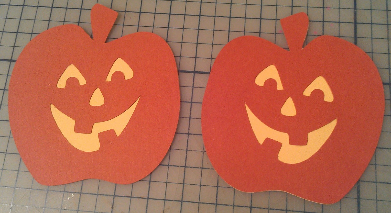 First I cut out two Jack o' Lanterns at 3 inches. Using my Gypsy, I cut two more without the face features.That way I can layer them without the yellow showing through the face features. (You could also use the shadow feature, but I wanted my pumpkins to mimic carved pumpkins.)